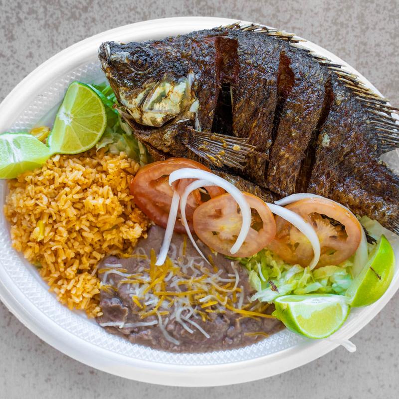 All plates come with refried beans, rice, lettuce, tomato, sour cream, shredded cheese, three fresh made corn tortillas